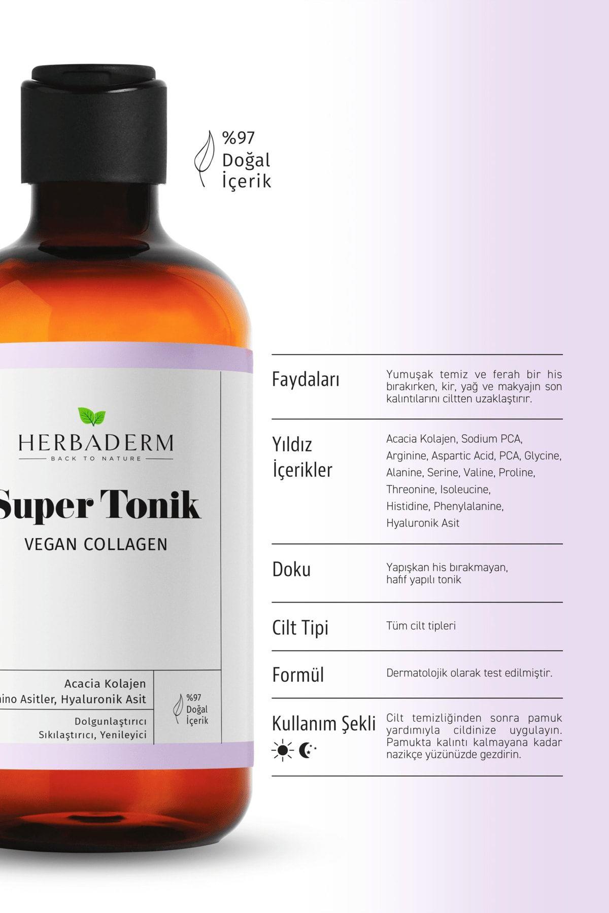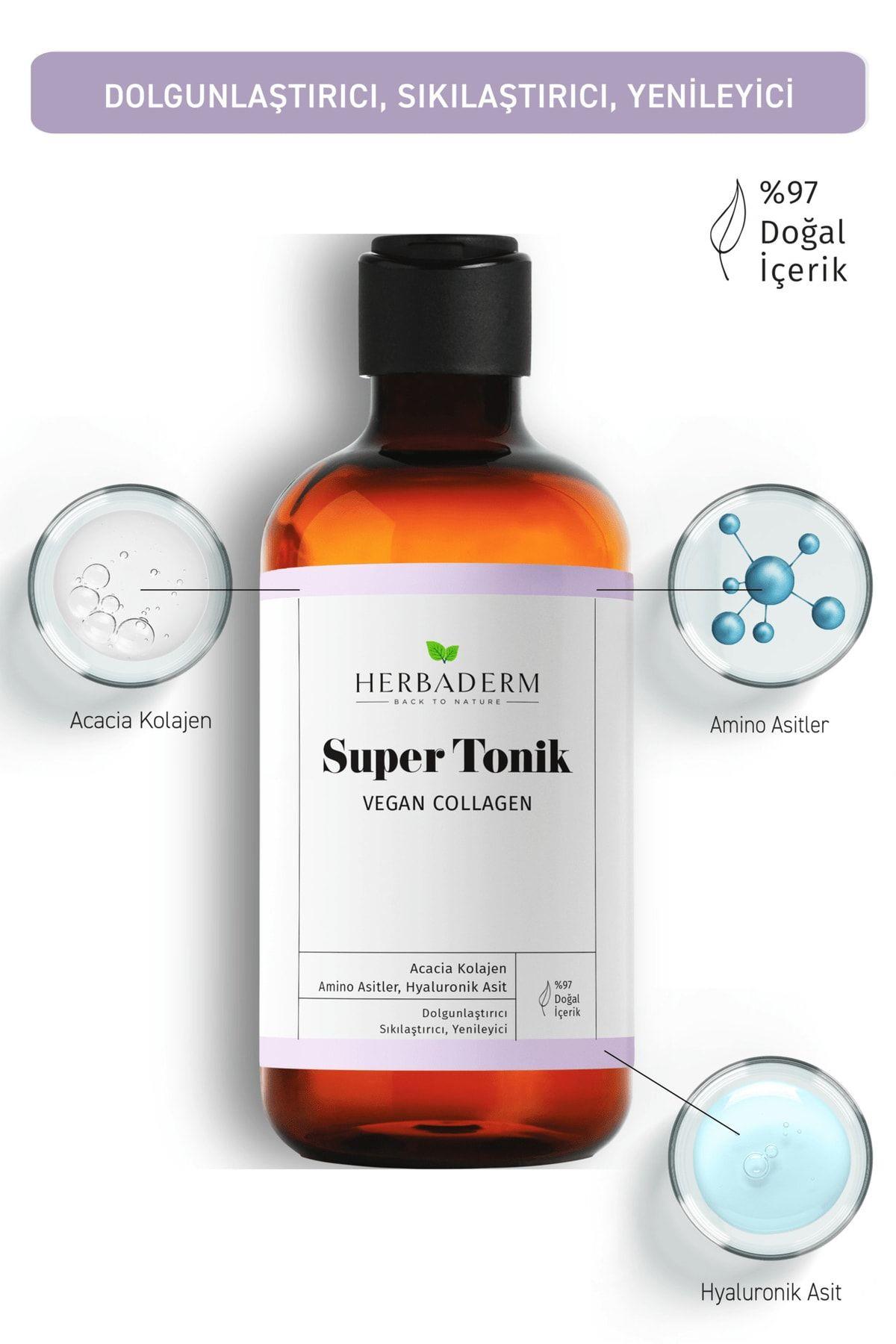 ÜRÜN ÖZELLİKLERİ Dolgunlaştırıcı, Sıkılaştırıcı, Yenileyici Gözenekleri, kir, yağ ve makyaj kalıntılarından arındırır. ; Vegan Kolajen ve 10 farklı amino asit içeriği ile cildi sıkılaştırır, çizgi ve kırışıklıkların göru?nu?mu?nu? önlemeye yardımcı olur. ; Sıkı ve dolgun cilt göru?nu?mu? sağlarken, Hyaluronik asit ile cildi rahatlatır ve nemlendirir. ; Cildinizi serum ya da nemlendiriciye hazırlar, arındırılmış cilt nemlendiricileri ve serumları daha etkin şekilde emer. ; Form: Su Bazlı Tonik Dermatolojik Olarak Test Edilmiştir. ; ETKİLİ OLDUĞU CİLT PROBLEMLERİ Sarkma ve sıkılık kaybı CİLT TİPLERİ Tüm cilt tipleri için ETKİNLİĞİ KANITLANMIŞ İÇERİKLER Acacia Kolajen: Acacia Kolajen hayvansal veya sentetik kolajenin bitki kaynaklı bir ikamesidir. ; Akasya ağacından (Acacia senegal) elde edilen ve kolajeni taklit eden biyopolimerleri sayesinde cildi sıkılaştırır, genç ve dolgun bir görünümü destekler. ; Amino Asitler -Arginine, Glycine, Alanine, Serine, Valine, Proline, Threonine, Isoleucine Histidine, Phenylalanine- : Amino asitler, doğal kolajen ve elastin üretimini destekleyerek cilt sıkılığının ve elastikiyetinin artmasına yardımcı olur. ; Hyaluronik Asit: Hacminin 6 katı su tutma özelliğine sahip Hyaluronik Asit cildi yağlandırmadan nemlendirir. ; NE ZAMAN VE NASIL UYGULANIR Cilt temizliğinden sonra pamuk yardımıyla cildinize uygulayın. ; Pamukta kalıntı kalmayana kadar nazikçe yu?zu?nu?zde gezdirin. ; Uyarılar:Harici kullanım içindir. ; Çocuklardan uzak tutunuz. ; Saklama Koşulları: Serin ve kuru yerde saklayınız, direkt gu?neş ışığından uzak tutunuz. ; İÇİNDEKİLER Aqua, Butylene Glycol, Glycerin, Propanediol, Pentylene Glycol, Polyglyceryl-4 Laurate/Sebacate, Polyglyceryl-6 Caprylate/Caprate, Acacia Senegal Gum, Sodium Hyaluronate, Sodium PCA, Sodium Lactate, Arginine, Aspartic Acid, PCA, Glycine, Alanine, Serine, Valine, Proline, Threonine, Isoleucine, Histidine, Phenylalanine, Xanthan Gum, Tetrasodium Glutamate Diacetate, Hydroxyacetophenone.;